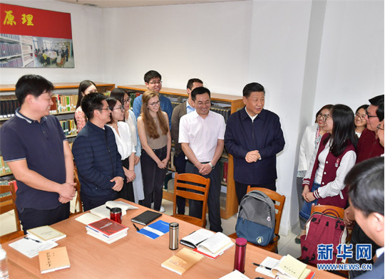 随后,习近平走进国际马克思主义文献中心,察看馆藏马克思主义典籍,询问“马藏工程”进展情况,称赞他们的工作非常有意义。阅览室里,一些中外学生正在就“解读新时代”进行座谈交流。习近平走到他们中间,认真倾听讨论,并同大家互动交流。总书记问大家为什么选择马克思主义专业、学习这个专业有什么体会,同学们兴奋地一一回答。同学们问总书记“您是一个坚定的马克思主义者,您学习马克思主义有什么好的方法”,总书记热情同大家分享了自己的学习经验。他对在场的外国留学生说,要了解中国,就要了解中国的历史、文化、人文思想和发展阶段,特别是要了解当代中国的马克思主义。习近平强调,北京大学是中国最早传播和研究马克思主义的地方,为马克思主义在中国的传播和中国共产党的成立作出了重要贡献。今年是马克思诞辰200周年,也是《共产党宣言》诞生170周年。我们对马克思和《共产党宣言》的最好纪念,就是把党的十九大精神和新时代中国特色社会主义思想这一当代中国马克思主义研究好、宣传好、贯彻好。他勉励大家紧密联系世情国情党情的变化,认真开展新时代中国特色社会主义思想研究,拿出更多有分量有说服力的研究成果。