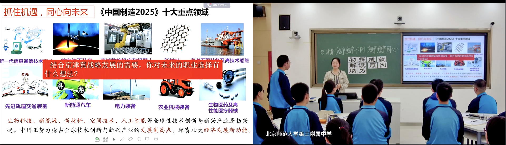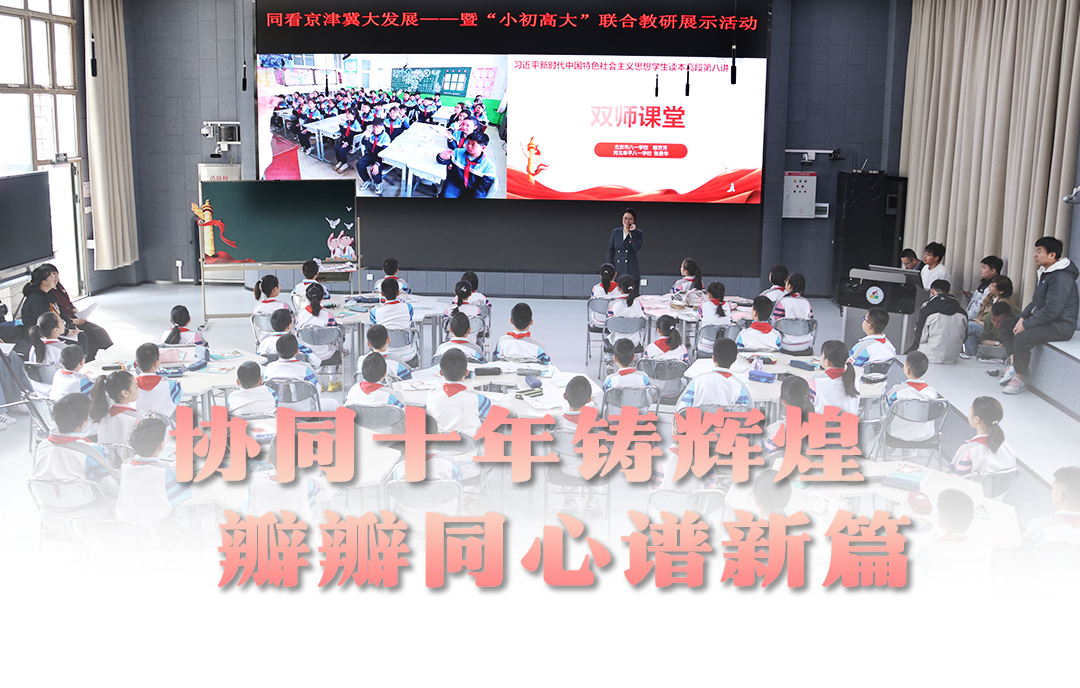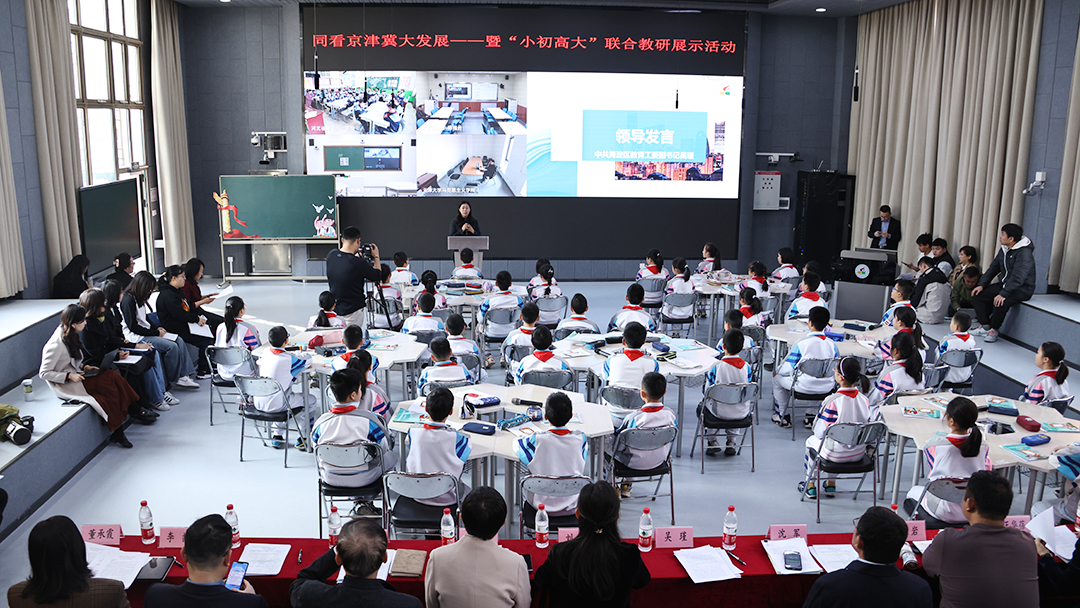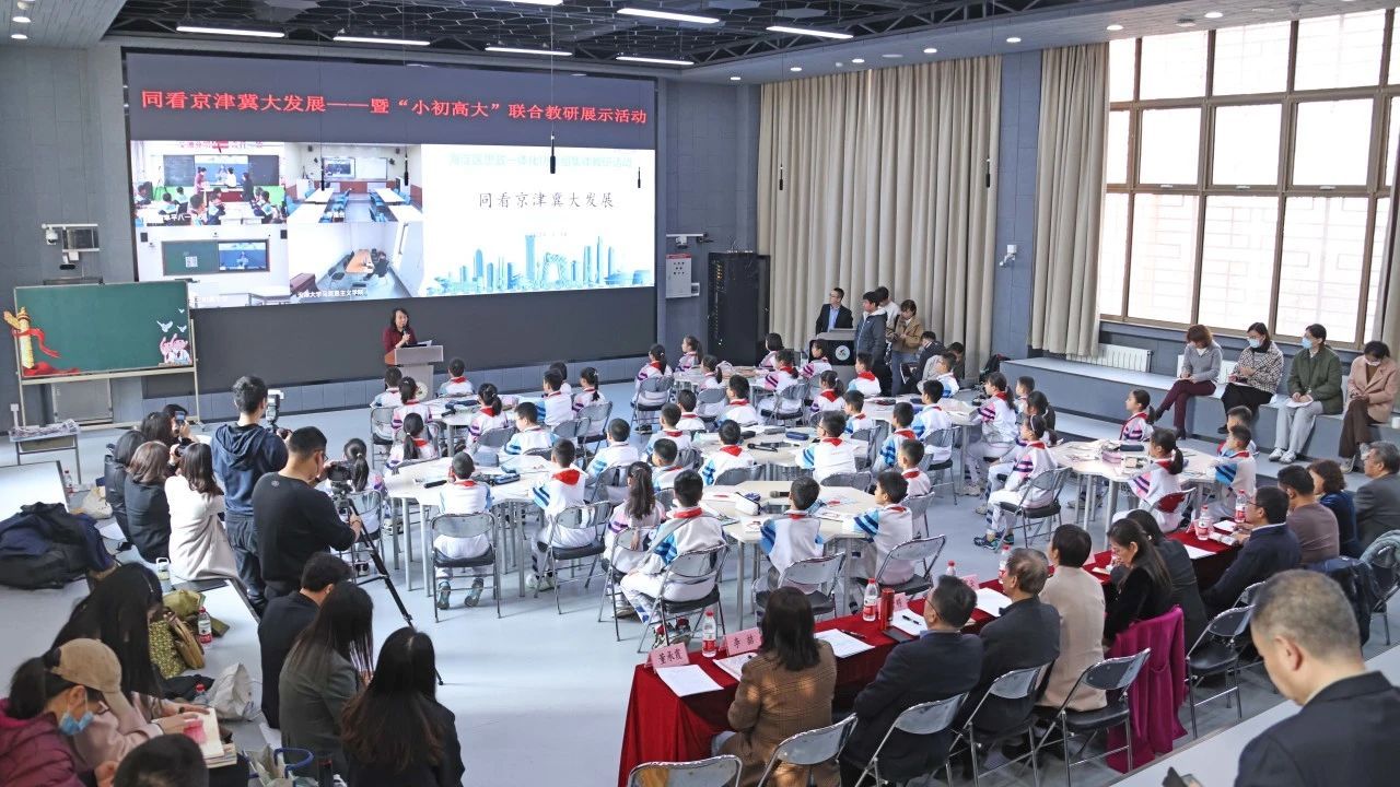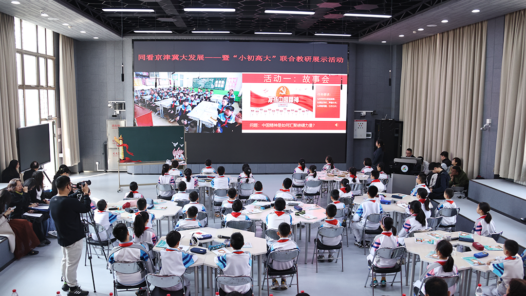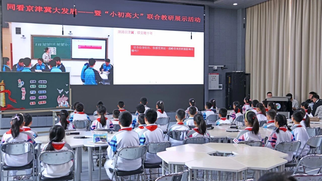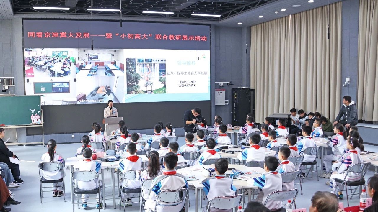 京津冀协同发展战略实施10周年之际,2024年3月15日,同看京津冀大发展——暨“小初高大”思政课联合教研活动,在北京市八一学校联研教室成功举行。师生共同站在历史发展的当下,通过一节思政课感受十年巨变。这是一次线上线下深度融合,以小学、初中、高中、大学,不同学段教学设计与实施为一体的大思政联研现场展示活动,旨在发挥京津冀三地不同学校的各自优势,围绕同一主题,开展符合不同学段学生发展水平的教育教学联研活动,从而实现循序渐进育人、螺旋上升铸魂的良好效果。