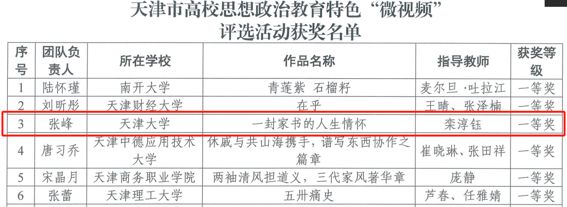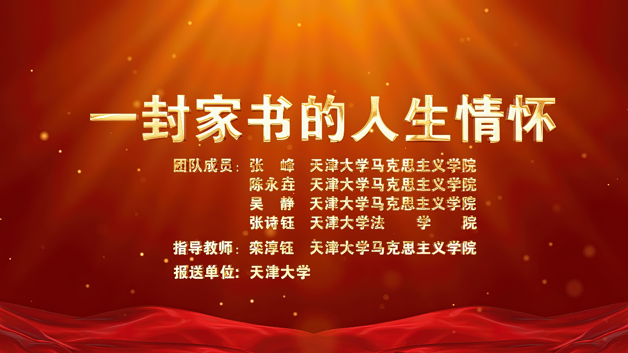为深入学习贯彻习近平新时代中国特色社会主义思想和党的二十大精神,落实全国和天津市“大思政课”综合改革相关部署要求,推动思政工作优势与媒体信息技术深度融合,增进文化自信自强,天津市教育两委下发了《关于开展天津市高校思想政治教育特色“微视频”评选活动的通知》。经专家评审,由天津大学马克思主义学院报送的作品《一封家书的人生情怀》荣获天津市一等奖。