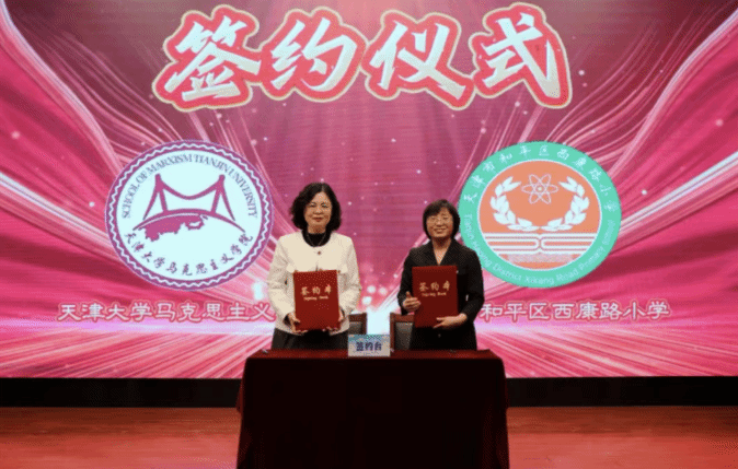 为进一步推动思政教育纵向衔接、横向贯通,天津大学马院与西康路小学现场签订共建协议。根据协议,双方将围绕教学资源共享、师资联合教研、课程协同开发等领域建立常态化合作机制。天津大学马院将定期选派优秀师生参与小学思政课堂建设,通过集体备课、示范教学、课题共研等方式,助力基础教育阶段思政课提质增效。