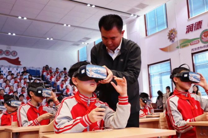 作为本次活动的教学亮点,“VR沉浸式体验”由天津大学马院联合校内外技术团队共同设计引入。借助虚拟现实技术,西康路小学的学生们“走进”模拟边境线,亲手为电子界碑描红,身临其境感受边防官兵的坚守与奉献。这一环节突破了传统课堂的时空限制,将抽象的国家安全理念转化为可感、可触的实践体验,成为大中小学思政课一体化教学创新的生动案例。