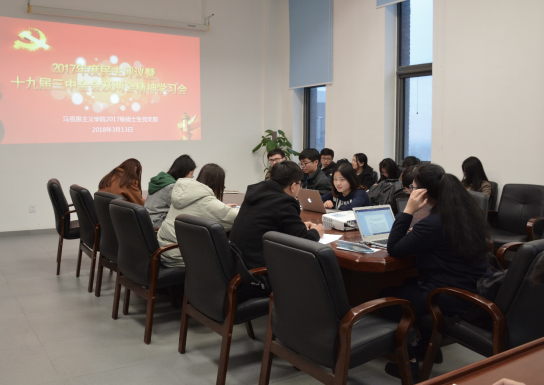 为深入学习贯彻党的十九大精神,根据《中共中央组织部关于召开2017年度基层党组织组织生活会和开展民主评议党员几个问题的通知》和《中共天津市委组织部关于召开2017年度基层党组织组织生活会和开展民主评议党员的通知》要求,结合支部工作实际,马克思主义学院2017级硕士生党支部于3月13日晚6:00在学院319会议室召开2017年度民主评议暨十九届三中全会及两会精神学习会。会议由党支部宣传委员安佳宝主持,学工部席皓格老师和学院辅导员刘楠老师列席会议。