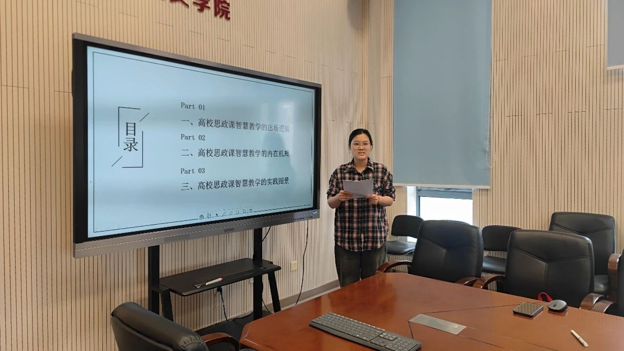 主讲人张双双作了“高校思政课智慧教学的理论与实践探析”的论文分享。她认为在培育创新创造人才、改革思政课教学方法、满足数字土著个性发展等需要推动下,高校思政课智慧教学得以出场。坚持“以学生为中心”、运用现代信息技术、培养综合性人才构成开展智慧教学的理念前提、手段和中介、育人目标。应当打造一支具备现代教学理念和技术的教师队伍、建造实施虚实结合的育人空间环境,在此基础上探索并应用思政课的智慧教学模式。