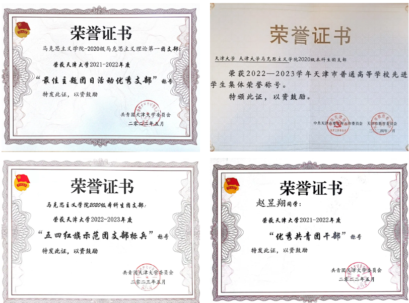 马克思主义学院2020级本科生团支部书记的身份点亮了我的整个大学时光,担任团支书的三年,我带领支部连续三年获评天津大学先进集体,以及最佳主题团日活动优秀支部、抗疫特别贡献团支部、五四红旗示范团支部和五四红旗示范团支部标兵等,更是获评了2023年度“天津市先进学生集体”荣誉称号。首届马院学生会主席、马院新媒体中心主任、学院兼职辅导员、社团中心策划部部长、宣传部学生助理等宝贵的学生工作经历不仅丰富了我的大学生活,也教会了我如何在服务同学中实现自我价值,更重要的是,让我深刻理解到作为一名马克思主义理论专业学生的责任与担当。