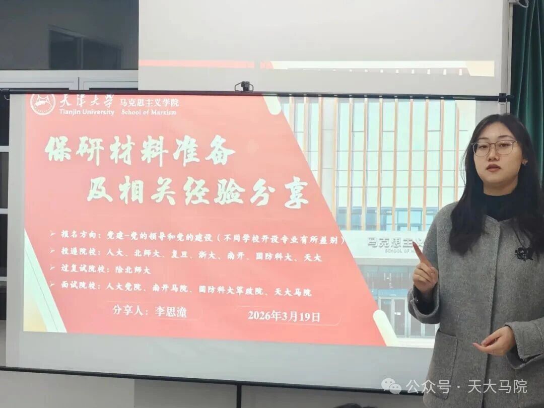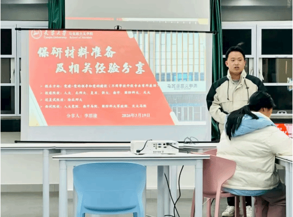 为推动学院学风建设,充分发挥朋辈引领作用,帮助同学们深入了解升学深造相关事宜,明确未来发展方向,马克思主义学院升学经验分享交流会于3月19日晚在齐园十三斋一站式学生社区顺利举行。七位顺利保研考研上岸的优秀本科生倾情分享,从择校规划、材料准备到复习技巧、考核应对,全方位拆解升学重难点,为学弟学妹们送上满满 “干货”。