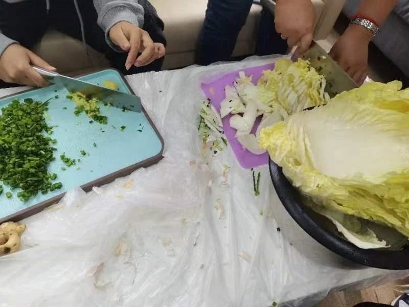 活动伊始,老师们提前准备好了包饺子所需要的工具,肉馅、蔬菜、面皮、佐料等食材一应俱全。同学们热情高涨,大家围在桌前,一边说说笑笑地叙日常,一边热热闹闹地洗菜、切菜、和馅儿、包饺子,忙的不亦乐乎。