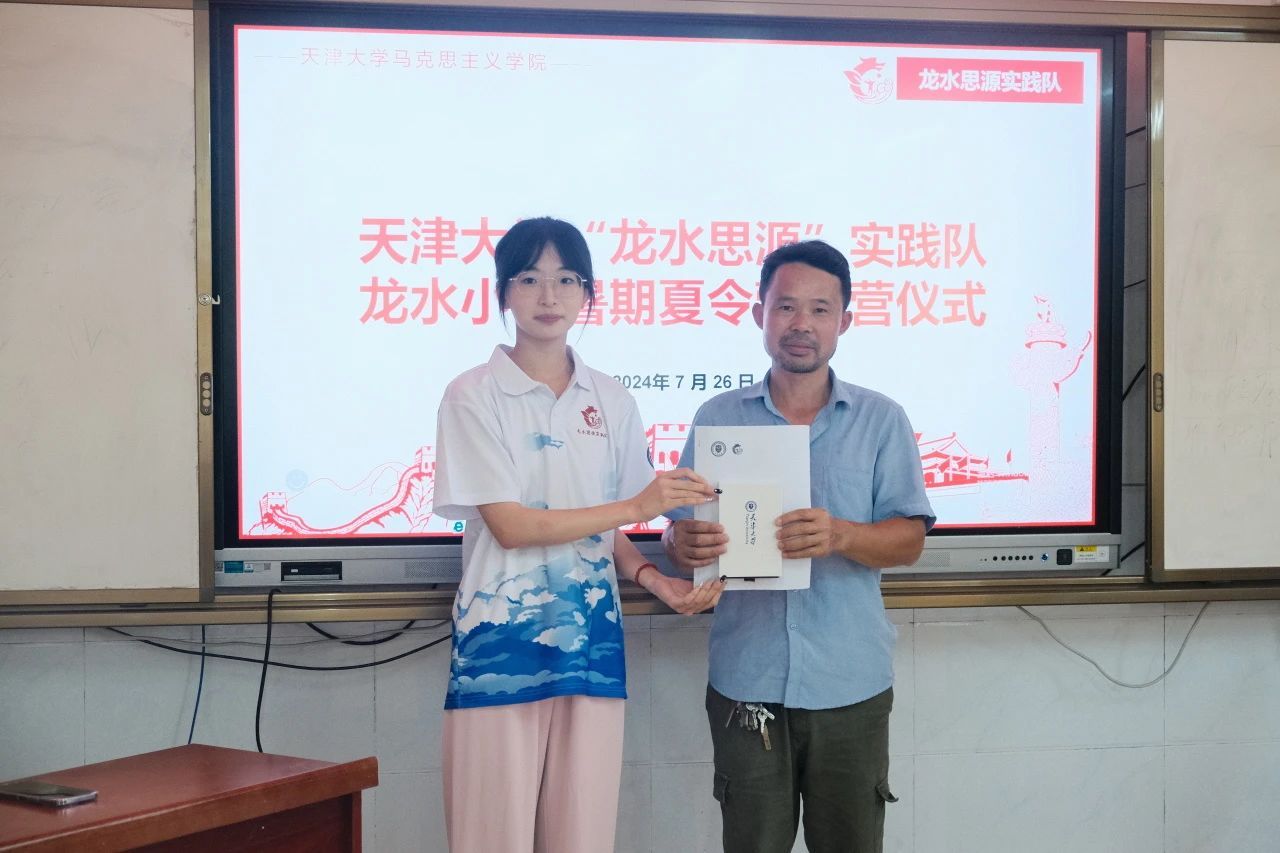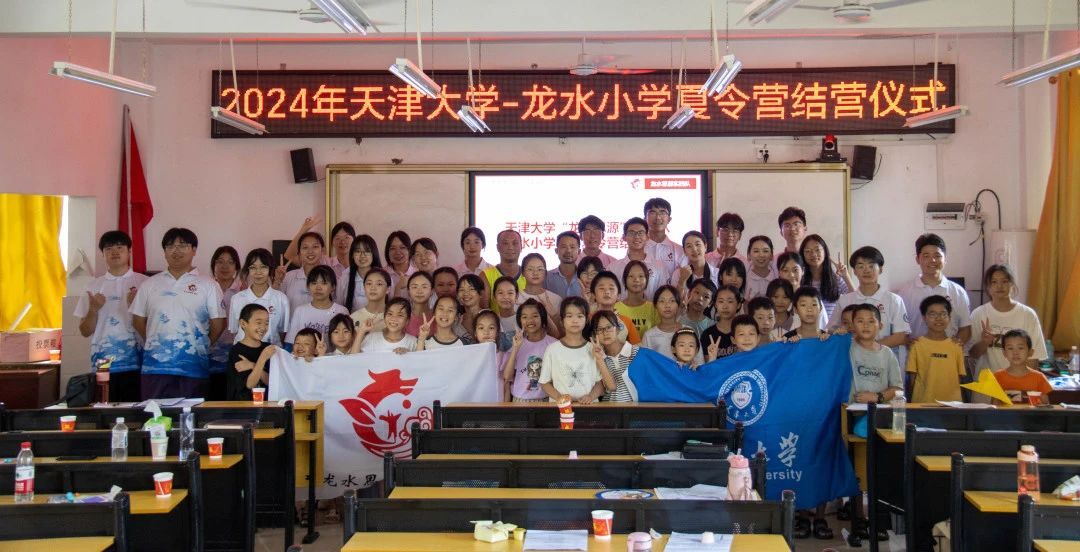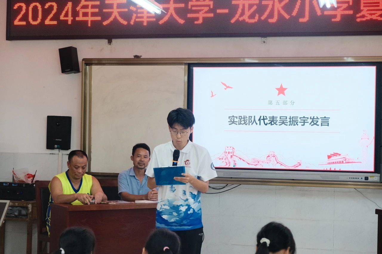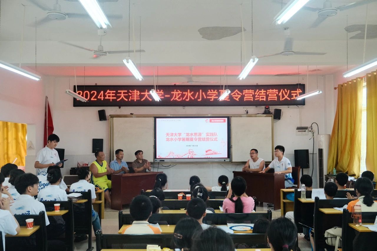 2024年7月26日上午10点,天津大学龙水思源实践队暑期夏令营结营仪式在龙水小学举行。龙水小学校长董文军、龙水小学副校长唐涛、李军与邓秋华、天津大学辅导员赵悦镔、龙水小学师生、天津大学龙水思源实践队全体队员参加仪式。