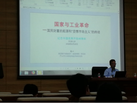 6月20日下午,由天津大学马克思主义学院、人文社科处、校党委宣传部主办的纪念改革开放40周年——“思想时空”论坛:社会主义现代化系列之首场讲座在卫津路校区科学图书馆二层报告厅举行,北京大学新结构经济学院访问教授、美国联邦储备银行助理副行长文一先生受邀做主题为“国家与革命——国民财富的起源和空想社会主义的终结”的学术报告。