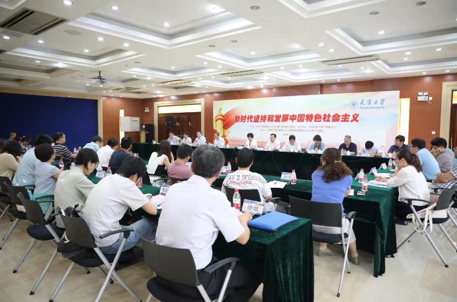 为深入学习贯彻习近平总书记在“不忘初心、牢记使命”主题教育工作会议上的重要讲话精神, 落实中共中央关于印发《习近平新时代中国特色社会主义思想学习纲要》(以下简称《纲要》)的通知精神,推动习近平新时代中国特色社会主义思想进一步深入人心,近日,由天津市中国特色社会主义理论体系研究中心、天津大学和天津市社会科学界联合会主办,天津市中国特色社会主义理论体系研究中心天津大学基地承办的“新时代坚持和发展中国特色社会主义”研讨会在天津大学卫津路校区科学图书馆举行。天津市社科界50余名专家学者和天津大学马克思主义学院思政课教师代表参加了会议。