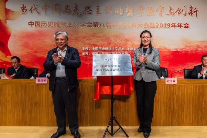 本站讯(通讯员 马明)2019年11月8日至10日,中国历史唯物主义学会、天津大学主办,天津大学马克思主义学院承办的中国历史唯物主义学会第八届会员代表大会和“当代中国马克思主义的哲学坚守与创新”理论研讨会暨中国历史唯物主义学会2019年年会在天津市举行,选举产生了中国历史唯物主义学会新一届领导班子,来自全国各地的会员代表、论文代表、专家学者300多人与会并展开深入研讨。“天津大学新媒体意识形态建设研究中心”在年会期间揭牌。