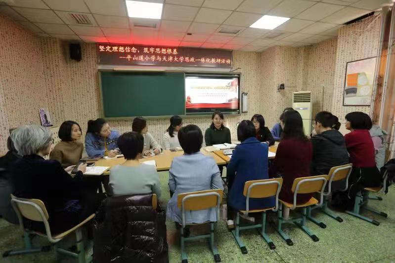 签约仪式后,平山道小学教师罗杨上了一节“书法思政”课,巧妙将中华传统文化书法与思政相融合,展示了学校课程思政的研究成果。天大马克思主义学院青年教师栾淳钰以《坚定价值观自信》为主题,为五年级学生上了一节思政示范课。两校教师还围绕“守政创新办思政,立德铸魂育新人”“坚定理想信念,筑牢思想根基”等主题展开深入研讨和交流。