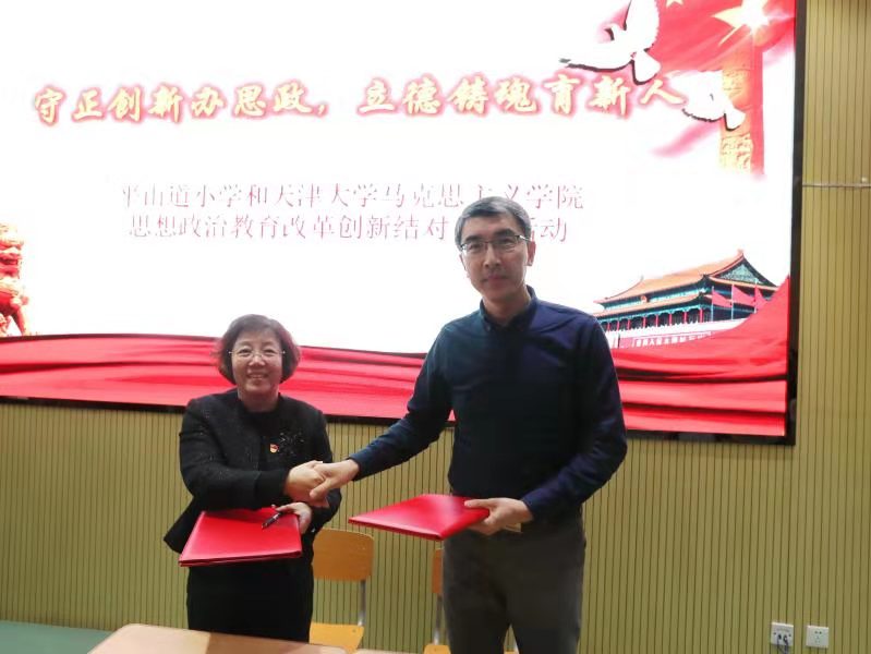 守正创新办思政,立德铸魂育新人。12月3日,天津大学马克思主义学院和平山道小学“思想政治教育改革创新结对共建”活动在平山道小学举行。平山道小学校长韩洪涛和天大马克思主义学院党委书记徐斌,分别介绍了双方学校思政工作的情况,并对双方下一步深度合作,共同推动大中小学思政一体化前景进行了规划。在天津市教委、河西区教育局相关科室和双方师生代表的见证下,平山道小学党支部书记徐晓春与徐斌签订了共建协议。