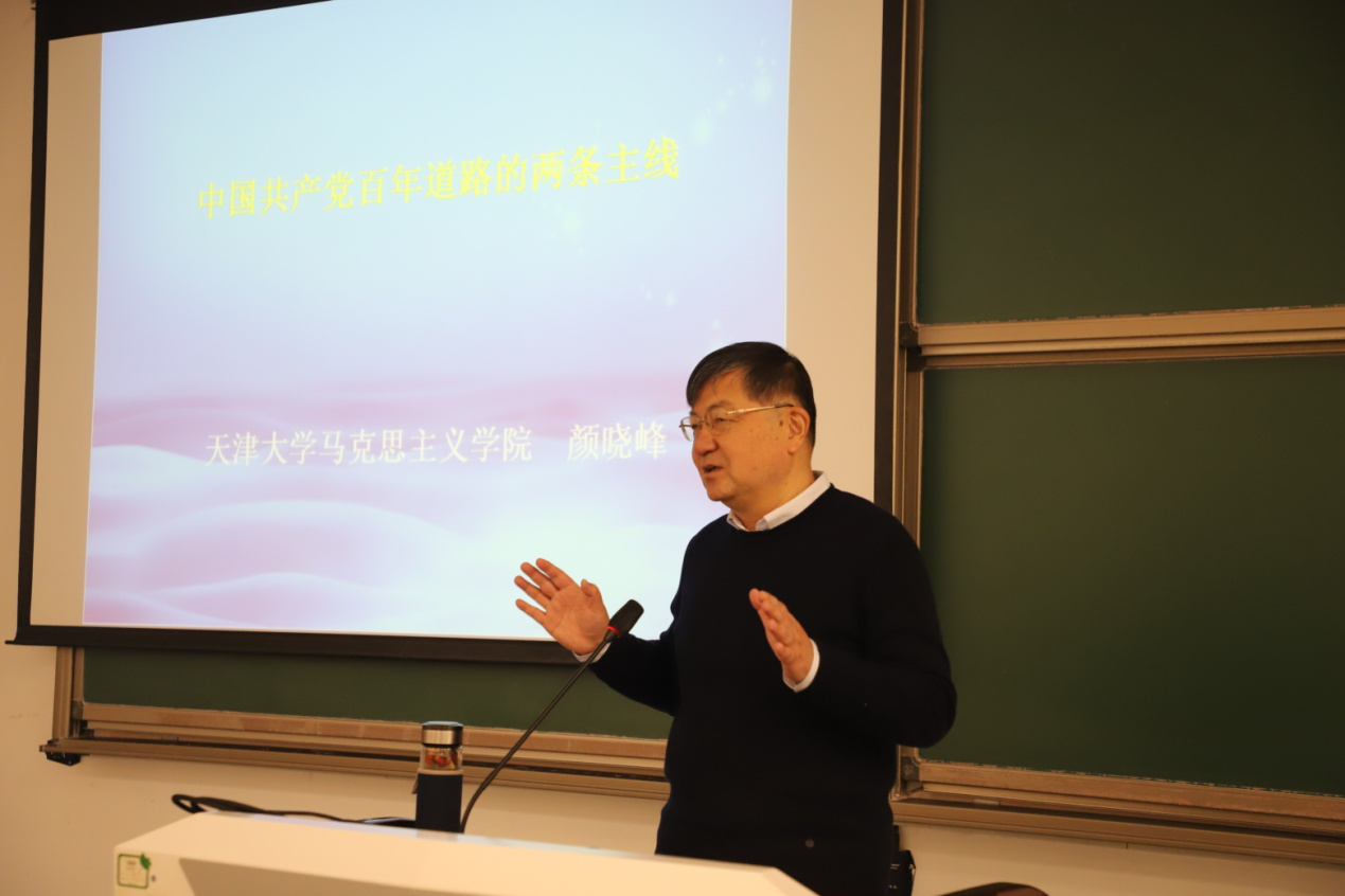 报告中,颜晓峰从问题提出、历史梳理、理论分析等方面对“中国共产党百年道路的两条主线”展开了分析与讲解。他提出,中国共产党的百年历史是不断推进马克思主义中国化的过程,推进马克思主义中国化要深刻把握普遍性与特殊性、理论与实践这两条基本线索。他从普遍性与特殊性的辩证关系角度分析了改革开放以来马克思主义中国化的历史进程的成功的原因。习近平新时代中国特色社会主义思想作为马克思主义中国化最新成果,既是实践基础上的理论创新,又是以理论创新指导实践创新,既体现了新时代理论与实践的融合发展,也体现了具有特殊性的当代中国马克思主义与普遍性的21世纪的马克思主义之间的辩证关系。同时,中国特色社会主义向世界历史转变过程也就是特殊性向普遍性的转变过程。最后,颜晓峰提出了中国化的马克思主义、21世纪的马克思主义的四大意义与四大使命,即中国化的马克思主义不仅有其时代意义、理论意义、实践意义与世界意义,同时有其时代使命、理论使命、实践使命与世界使命。