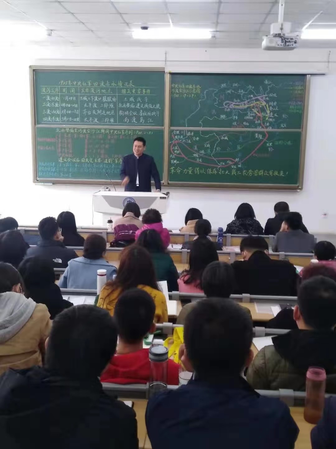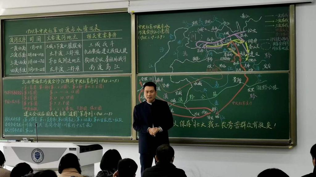 程斯宇的讲课果然别具一格,让同仁们眼前一亮。他用大幅精确直观的手绘地图板书,大量真实翔实的史料,将那段伟大的党史娓娓道来。观摩的老师们被深深吸引住了,个个认真“取经”,时时做笔记、拍照、录视频。课堂气氛非常活跃。