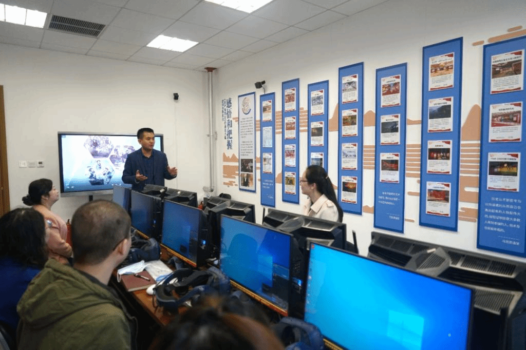 会后,教务处党支部党员代表参观调研了马克思主义学院虚拟仿真教室,聆听王磊老师“建党百年铭初心,虚拟体验长征路”党课,戴上VR眼镜“与红军战士一起爬雪山、过草地,置身开国大典的宏阔现场”……感受到真切深刻的党史教育。