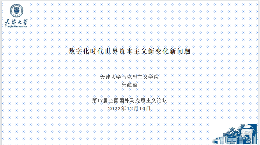 分论坛一“当代国外马克思主义的前沿问题研究”中,宋建丽教授以“数字化时代世界资本主义新变化新问题”为题发言。她指出对于理解数字化时代的世界资本主义新变化新问题而言,四个维度至关重要:劳动形态的数字化与世界资本主义的资本积累问题研究;地理空间的数字化与世界资本主义的数字殖民问题研究;社会治理的数字化与世界资本主义意识形态霸权问题研究;日常生活空间的数字化与世界资本主义的数字异化问题研究。从历史唯物主义的视野出发,批判性地审视数字化时代世界资本主义的新变化新问题,有助于理解大数据时代技术、资本与超级权力之间的辩证关系,把握世界资本主义发展的新动态、新矛盾,彰显数字资本主义对真实社会关系的遮蔽,从而为推进21世纪马克思主义全球数字治理话语体系的建构,为已经开启社会主义现代化新征程的我国超越西方现代性局限、防范化解各种重大风险挑战,提供有益参考。