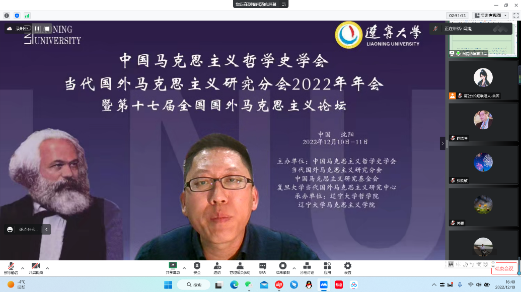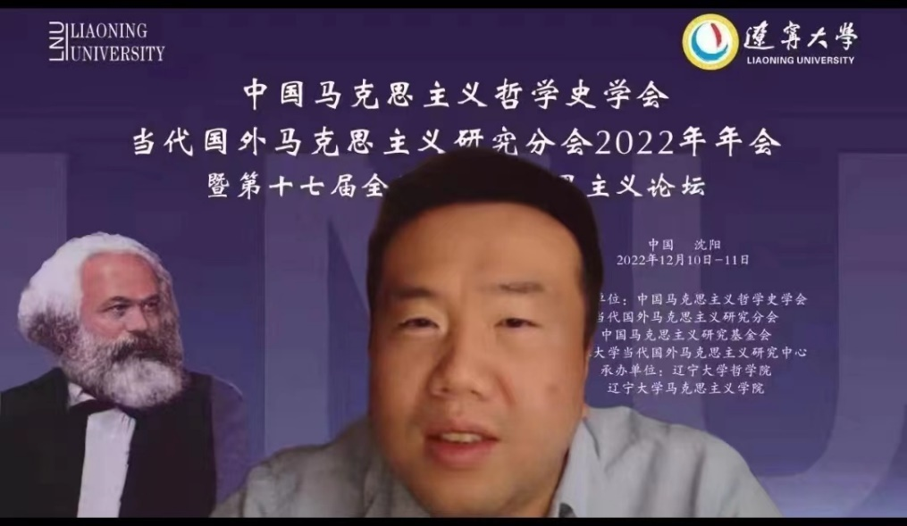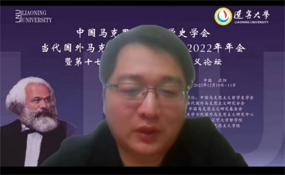 2022年12月10日,由中国马克思主义哲学史学会、当代国外马克主义研究分会、中国马克思主义研究基金会、复旦大学当代国外马克思主义研究中心主办、辽宁大学哲学院、辽宁大学马克思主义学院承办的“中国马克思主义哲学史学会当代国外马克思主义研究分会2022年年会”暨第十七届全国国外马克思主义论坛顺利举办,来自全国多所院校的专家学者、师生代表参加会议。因受疫情影响,本次学术研讨会以线上会议的形式召开,我院宋建丽教授、张巍副教授、闫涛副教授、史凤阁助理研究员参会,并分别在不同的分论坛做口头报告。