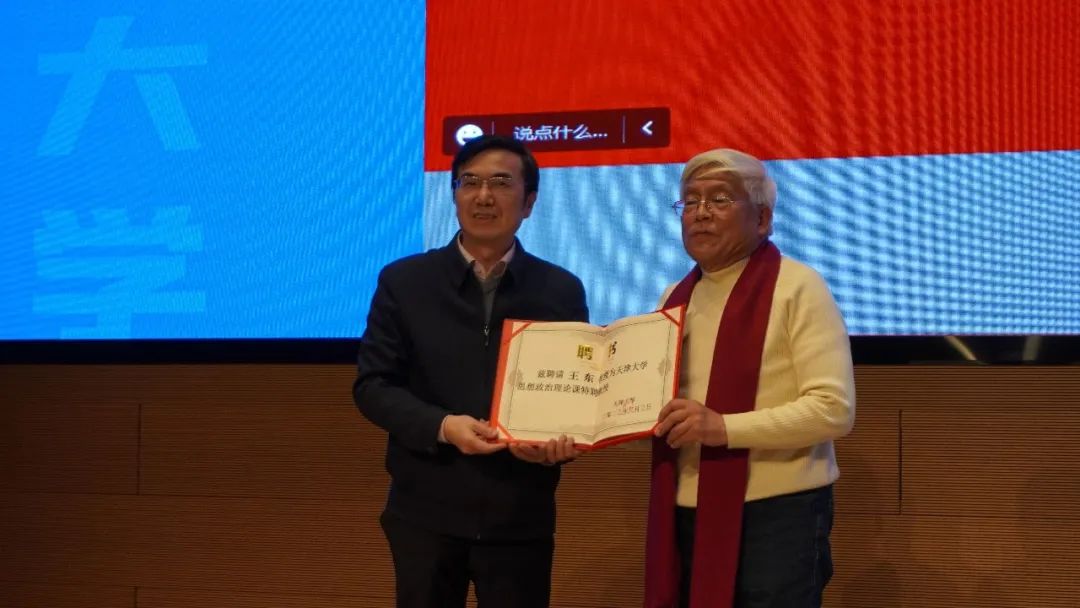 此外,为进一步加强学校思想政治理论课改革创新与发展建设,指导、带动青年思政课教师不断成长,学校聘请王东教授担任我校思政课特聘教授。天津大学党委常委、宣传部长杨欢为王东教授颁发了聘书,并赠送学生设计的文创作品留念。