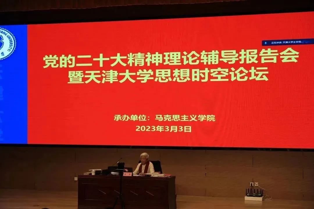 3月3日,由学校党委宣传部和马克思主义学院共同举办的“党的二十大精神理论辅导报告会暨天津大学思想时空论坛”在北洋园校区郑东图书馆南馆一层报告厅开讲。思想时空论坛是在学校党委指导下,依托马克思主义学院打造的高水平理论宣讲平台。北京大学王东教授受邀担任本次论坛主讲人,校党委常委、组织部部长贾启君,校党委常委、宣传部部长杨欢出席本次论坛,校院两级理论中心组成员及马院师生二百余人到会聆听,同时,线上会议也吸引了来自全国各大高校三百余人参加。