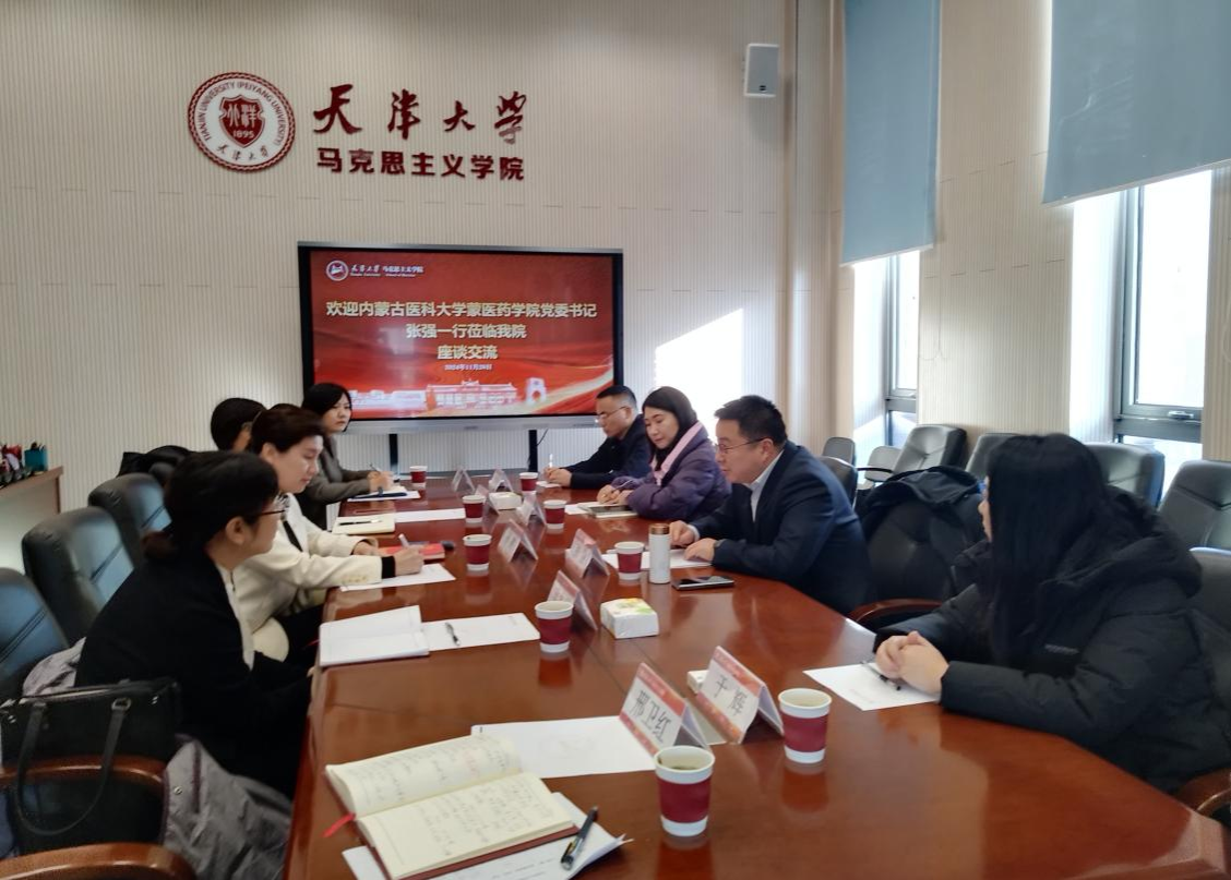 11月28日,内蒙古医科大学蒙医药学院党委书记张强一行到马克思主义学院座谈交流。学院党委书记孙鹤主持会议,副书记靳莹、研究生思政课教研部党支部书记、“兴学之路—乡村振兴中的青春实践”国家级一流课程负责人吴兆彤、天津大学青年发展中心研究员、少数民族学生辅导员、马院青年教师王恒、党委组织员邢卫红参加了座谈交流。