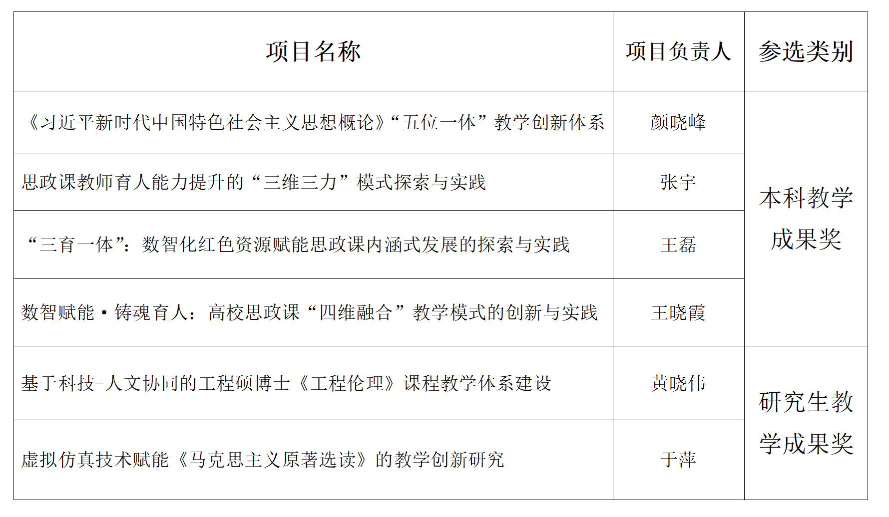 按照《天津大学关于开展2025年校级教学成果奖评审工作的通知》要求,我院可推荐不多于4个项目参加校级本科教学成果奖评选、不多于4个项目参加校级研究生教学成果奖评选。经前期教师申报,学院本科教学指导委员会投票,学院党政联席会审议,拟推荐“《习近平新时代中国特色社会主义思想概论》‘五位一体’教学创新体系”等4项参评校级本科教学成果奖,“基于科技-人文协同的工程硕博士《工程伦理》课程教学体系建设”等2项参评校级研究生教学成果奖。参评项目如下: