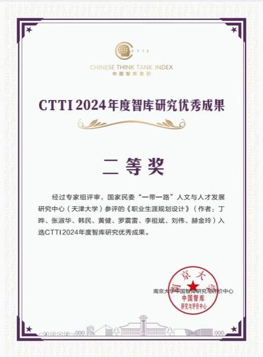 国家民委“一带一路”人文与人才发展研究中心(天津大学)2022年被选入中国智库索引CTTI 以来,2022年度获得优秀案例一项《新型智库能力建设之赋能人才全方位发展新路径》,优秀成果二等奖二项;《图解国别中高等教育制度》(作者:杜修平、吉琳玄、张馨蕊、李敏、美合日古丽.托合提、李静、叶海燕)、《21世纪中外文化教育的交流与融合发展》;2023年度获得优秀成果二等奖一项《薪火相传——立党兴党强党的丰厚精神滋养》(作者颜晓峰)。今年又喜获两个奖项。国家民委“一带一路”人文与人才发展研究中心(天津大学)在学校的支持领导下,马克思主义学院具体推动下,锚定教育强国战略目标,在整合学校智库资源的基础上,聚焦“文化融合与人才发展”,着力打造国际化、创新型、高质量的智库建设。2022年历经三年完成了中华人民共和国职业分类大典“职业生涯规划师”职业申请,目前正在进行着国家职业生涯规划师职业标准制定建设;2021年起连续四年成功举办四届“一带一路”《中国人文与人才中国》国际论坛,2025年四月末将举办第五届“一带一路”《中国人文与人才中国》国际论坛,向世界发声:“世界由您了解中国.中国因您影响世界”,以此汇聚全球智慧,为实现人类命运共同体而努力。