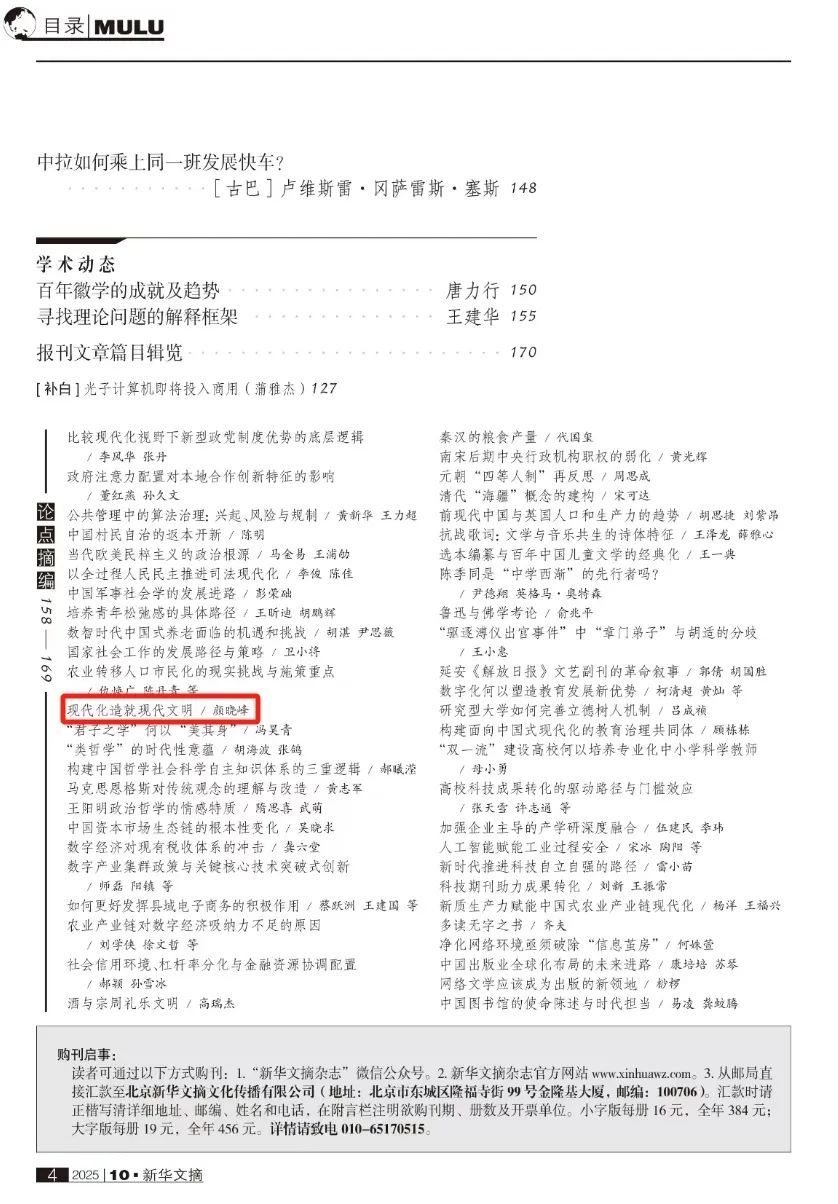 近日,《新华文摘》2025年第10期论点摘编了天津大学马克思主义学院院长颜晓峰发表于《天津大学学报(社会科学版)》2025年第1期的文章《在进一步全面深化改革中发展中国式现代化的文明形态》。