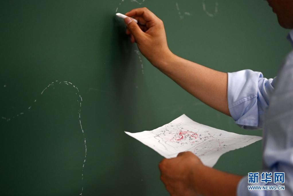 天津大学马克思主义学院青年教师程斯宇在教室里手绘“中央红军四渡赤水、巧渡金沙江”示意图(6月21日摄)。新华社记者 李然 摄