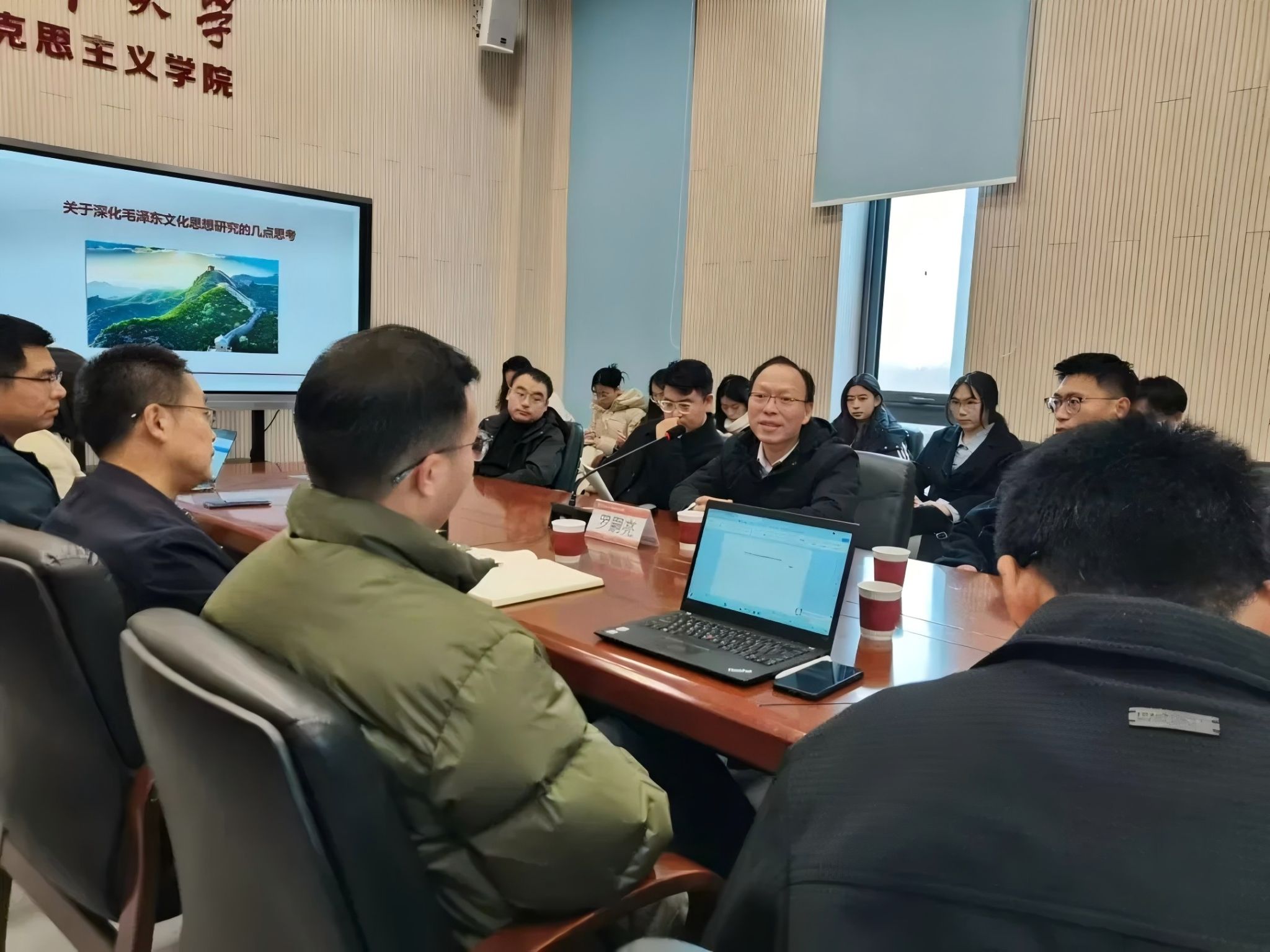 罗老师从“关于毛泽东文化思想著作文本的研究”“关于毛泽东文化思想内涵及其‘魂脉’和‘根脉’的研究”“关于毛泽东文化思想的历史实践研究”“关于‘文人毛泽东’的研究”四个角度展开。
